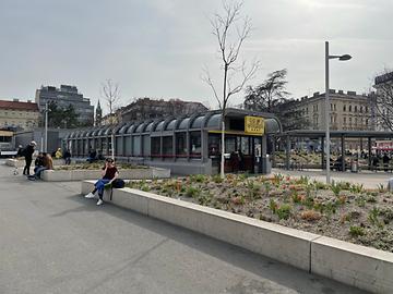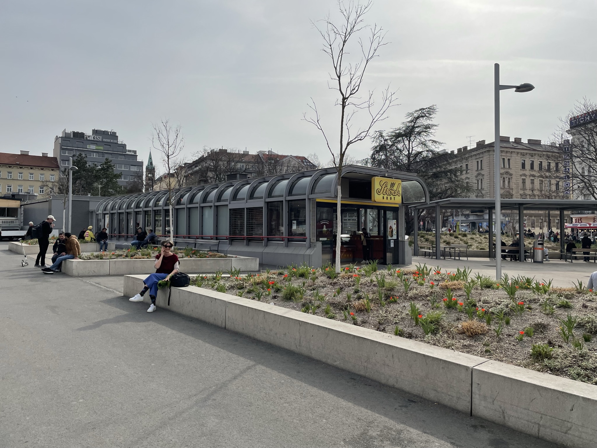 In der Mitte des Platzes befindet sich eine Parkanlage, die bis September 2017 von Straßenbahngleisen geteilt wurde. Daneben befinden sich zwei Abgänge zur U-Bahn-Station, die 1978–2017 die südliche Endstation der U-Bahn-Linie U1 war. Seit 2. September 2017 gibt es die neue Endstation der U1 bei der Therme Wien. Die U1 verbindet den Platz in wenigen Minuten mit dem Stadtzentrum. An den Rändern der Grünanlage sowie neben und hinter dem Amalienbad befinden sich Endstationen der städtischen Autobuslinien 7A, 65A, 66A, 68A und 68B. Die regionalen Buslinien haben nun den Busbahnhof Oberlaa als neue Wiener Endstation