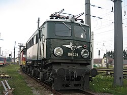 | Die Elektrolokomotive ÖBB 1040.010-9 auf dem Gelände des Südbahnmuseums in der steiermärkischen Stadtgemeinde Mürzzuschlag. Die Baureihe 1040 war die erste österreichische Neubau-Elektrolokomotive der Nachkriegszeit. Sie wurde von der Lokomotivfabrik Floridsdorf (mech. Teil) und der Firmengemeinschaft ABES (elektr. Teil: AEG, BBC, ELIN, Siemens) in zwei Baulosen (.001-.010 & .011-.016) gefertigt und ab 1950 ausgeliefert. Die Lok hatte ein Dienstgewicht von 90,2 t, eine Motorleistung von 2.360 kW und eine Höchstgeschwindigkeit von 90 km/h: 1 . | Eigenes Werk | C.Stadler/Bwag | Datei:Mürzzuschlag - Südbahnmuseum, Lok „ÖBB 1040.010-9“.JPG | |