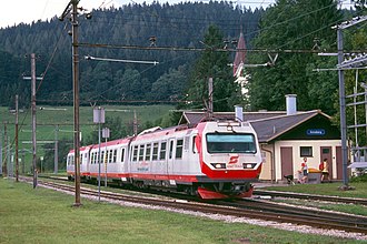 | Schmalspur-Triebwagenzug mit Triebkopf 4090 002 im Bahnhof Annaberg der Mariazellerbahn. | own image, scan from slide | Herbert Ortner , Vienna, Austria | Datei:ÖBB 4090 Annaberg.jpg |