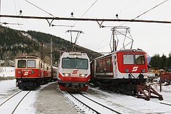 | Triebfahrzeuge der Mariazellerbahn im Bahnhof Mariazell: Auf dem Abstellgleis zwei 1099 mit einem langen Zug, 4090 003-7 auf dem Weg nach St. Pölten und die neu lackierte 1099 007-5 . | Selbst fotografiert | Herbert Ortner , Vienna, Austria | Datei:Mariazellerbahn 05.jpg | |