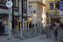 | Öffentliche Toilettenanlage in der Irisgasse im 1. Wiener Gemeindebezirk Innere Stadt . Diese öffentliche, unterirdische Bedürfnisanstalt wurde von der Firma Wilhelm Beetz im Jahr 1939 in der Irisgasse, die mit 17,5 Metern die kürzeste Straße Wiens ist, errichtet. | Eigenes Werk | C.Stadler/Bwag | Datei:Wien - Toilettenanlage, Irisgasse.JPG |