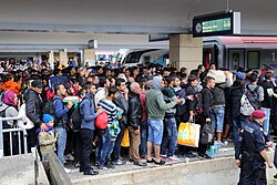 - 5. September: An diesem Tag wanderten illegal, jedoch von der Staatsgewalt toleriert, rund 9.000 Menschen[17] aus dem asiatischen Raum von Ungarn nach Österreich ein, wobei die meisten über den Westbahnhof Richtung Deutschland weiterreisten. Insgesamt kamen an diesem Wochenende etwa 16.000 Flüchtlinge von Ungarn über die österreichische Grenze, 15.000 reisten weiter nach Deutschland, 730 stellten Asylanträge in Österreich.[18][19] Siehe auch Flüchtlingskrise in Europa 2015