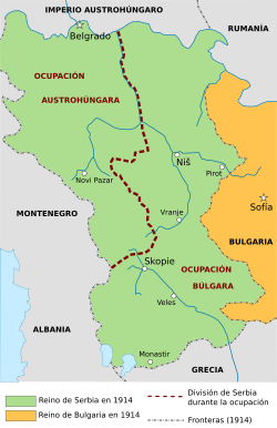 Ab dem 6. Oktober 1915 unternahmen die Mittelmächte nach Verhandlungen mit Bulgarien, die dessen Beitritt zum Bündnis herbeiführten, einen neuen Feldzug gegen Serbien. Bis Anfang Dezember 1915 konnten österreichisch-ungarische, deutsche und bulgarische Truppen ganz Serbien besetzen. Das Land wurde zwischen Österreich-Ungarn und Bulgarien aufgeteilt.[1]