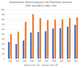 Die Vertiefungen der Handels- und Wirtschaftsbeziehungen führten vor allem dazu, dass sich das bestehende Defizit im Warenaustausch mit Österreich seit 1995 stetig verringert. So betrug 2001 die Deckung des slowenischen Exports und Imports 82,07 %.[76] Mit dem Eintritt Sloweniens in die Eurozone 2006 bzw. den Beitritt zum Schengen-Raum 2007 bekam der Handel zwischen den Ländern zusätzlichen Aufschwung.[77] Dennoch veränderte sich die Rolle Sloweniens als österreichischer Handelspartner kaum: Slowenien ist bis heute einer der wichtigsten Exportmärkte Österreichs. 2015 betrug der österreichische Import aus Slowenien 1,725 Mrd. Euro (~ 1,927 Mrd. USD), der Export hingegen 2,69 Mrd. Euro (~3 Mrd. USD).[78] Damit liegt Slowenien auf Platz 12 im Import-/ Exporthandel mit Österreich.[79] Im Bereich der Dienstleistungen sind die Verhältnisse umgekehrt: 2016 betrugen die österreichischen Importe aus Slowenien mit 885 Mio. Euro mehr als die Dienstleistungsexporte (608 Mio. Euro).[79]