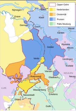 | Opdeling van Opper-Gelre na de Vrede van Utrecht | Eigenes Werk Sources used: (nl) Jappe Alberts, Prof.Dr. W (1972) Geschiedenis van de beide Limburgen, Deel I (tot 1632) Maaslandse Monografieën nr 15. 209pp, Van Gorcum, Assen (nl) Jappe Alberts, Prof.Dr. W (1974) Geschiedenis van de beide Limburgen, Deel II (1632 - 1918), Maaslandse Monografieën nr 17. 315pp Van Gorcum, Assen (nl) Wieland, J.H.M. (red.) (1989) Kleine atlas voor de geschiedenis van beide Limburgen, Eisma, Leeuwarden / Maastricht, ISBN 9070052717 ) (nl) Jacob Kuyper (1866) Gemeente-Atlas van Nederland naar officieele bronnen bewerkt (de) Irmgard Hantsche (2004) Atlas zur Geschichte des Niederrheins , Schriftenreihe der Niederrhein-Akademie 4, Peter Pomp, Bottrop/Essen (5e druk). ISBN 3-89355-200-6 (de) Irmgard Hantsche (2003) Geldern-Atlas , Karten und Texte zur Geschichte eines Territoriums, Veröffentlichungen des Historischen Vereins für Geldern und Umgegend Nr, 103, Verlag des Historischen Vereins für Geldern und Umgegend, Geldern, ISBN 3-921760-39-9 (de) Wilhelm Fabricius (1898) Erläuterungen zum geschichtlichen Atlas der Rheinprovinz. Zweiter Band: Die Karte von 1789. Einteilung und Entwickelung der Territorien von 1600 bis 1794 | Hans Erren | Datei:Gelre overkwartier 1715.svg |