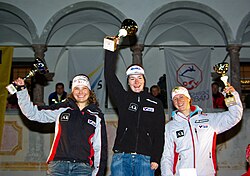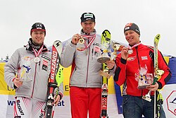 | Die Sieger des Riesenslaloms der Österreichischen Alpinen Skimeisterschaften 2009 : 1. Platz: Hannes Reichelt (mitte), 2. Platz: Mario Matt (links), 3. Platz: Joachim Puchner (rechts) | Eigenes Werk | Christian Jansky | Datei:Austrian Alpine Ski Championships 2009 Giant Slalom Men.jpg | |