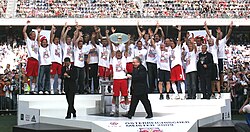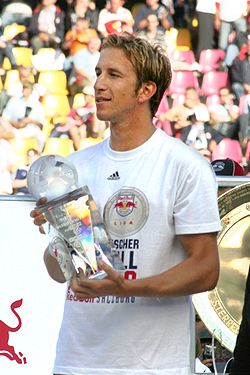 Der Kapitän des FC Red Bull Salzburg, Alexander Zickler, stemmt den Meisterteller in die Höhe