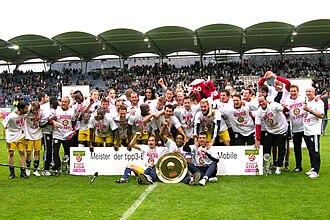 Nach einem spannenden Kopf-an-Kopf-Rennen setzte sich der mit ehemaligen Bundesligaspielern gespickte FC Pasching mit zwei Punkten Vorsprung vor dem WAC/St. Andrä durch. Nachdem der FC Pasching 2008 seine damalige Bundesligalizenz an den SK Austria Kärnten verkauft hatte, wurde dem Verein von der österreichischen Bundesliga eine dreijährige Sperre im Lizenzansuchen auferlegt. Der Verein durfte daher trotz des ersten Platzes nicht um eine Lizenz ansuchen und damit auch nicht an der Relegation um den Aufstieg teilnehmen. Zudem wurde dem Verein 13 Punkte abgezogen, weil er eben nicht um eine Lizenz ansuchte, wodurch auch der vermeintliche Meistertitel aberkannt wurde.[33][34] An der Relegation durfte demnach der zweitplatzierte WAC/St. Andrä teilnehmen, der sich gegen den SC-ESV Parndorf 1919 (Regionalliga Ost) mit 0:1 (A) und 4:1 (H) durchsetzte.