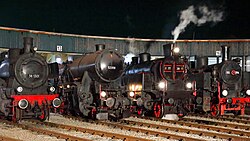 | Dampflokomotivenparade im Zuge der 21. Langen Nacht der Museen vor dem Ringlokschuppen des Eisenbahn- und Bergbaumuseums in der oberösterreichischen Marktgemeinde Ampflwang. Zu sehen sind die Dampflokomotiven (v.l.n.r) 38 1301 (Baujahr 1935), 52.1198 (Baujahr 1943), 77.28 (Baujahr 1920) und 93.1394 (Baujahr 1920). | Eigenes Werk | C.Stadler/Bwag | Datei:Ampflwang - Eisenbahn- und Bergbaumuseum, Lange Nacht der Museen.JPG | |