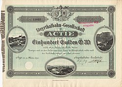 | Aktie über 100 Gulden ö. W. der Steyrthalbahn-Gesellschaft vom 31. März 1890 | Sammlung eines Mitglieds des Ersten Deutschen Historic-Actien-Clubs e.V (EDHAC e.V.); (kl) | Unbekannte Autoren und Grafiker; Scan vom EDHAC e.V. | Datei:Steyrthalbahn-Gesellschaft 1890.jpg | |