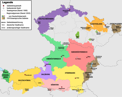 | Gebietsstand der Republik aufgrund des Gesetzes der provisorischen Nationalversammlung Deutschösterreichs vom 22.11.1918. Umfasst alle deutschsprachigen Gebiete und Länder der ehemaligen österreichischen Reichshälfte. Daneben ist die Grenze des heutigen Österreichs zum Vergleich angegeben. Die Länder Vorarlberg und Deutsch-Tirol bildeten ursprünglich eine gemeinschaftliche Provinz namens »Tirol-Vorarlberg«. Die Provinz wurde jedoch noch 1918 in die heutigen Gebietsteile aufgegliedert, da Vorarlberg bis 1920 gedachte, sich der Schweiz anzuschließen. Das heutige Tirol führte amtlich den Namen »Deutschtirol«, um sich von »Welsch-Tirol« (dem heutigen Trentino) abzugrenzen; »Deutschtirol« gehörte demnach natürlich auch das heutige italienische Südtirol an. Die deutschösterreichischen Provinzen im Einzelnen: Provinz Oberösterreich: 15.162 km², 1,03 Millionen Einwohner. 1910 bekannten sich für das ehemalige Kronland Österreich ob der Enns ohne Deutschsüdböhmen 99,7% der Einwohner als Deutsche und 0,2% als Tschechen. Provinz Niederösterreich: 22.048 km², 3,72 Millionen Einwohner. 1910 bekannten sich für das ehemalige Kronland Österreich unter der Enns ohne den Deutsch-Südmährischen Kreis 95,5% als Deutsche und 3,7% als Tschechen. 0,1% gaben ein anderes Volkstum an. Provinz Deutschböhmen: 14.496 km², 2,23 Millionen Einwohner. 1919 bekannten sich von den Einwohnern 2,07 Millionen als Deutsche und 116.275 als Tschechen. Provinz Sudetenland: 6.534 km², 678.880 Einwohner. 1919 bekannten sich von den Einwohnern 643.804 als Deutsche, 25.028 als Tschechen und 5.200 als Polen. Provinz Steiermark: 22.426 km², 1,44 Millionen Einwohner. 1910 bekannten sich von den Einwohnern 70,5% als Deutsche und 29,5% als Slowenen. Provinz Salzburg: 7.153 km², 214.997 Einwohner. 1910 bekannten sich 99,7% der Einwohner als Deutsche. Provinz Kärnten: 10.327 km², 394.735 Einwohner. 1910 bekannten sich 78,6% als Deutsche und 21,4% als Slowenen. Provinz Deutschtirol: 20.047 km², 1,09 Millionen Einwohner. 1910 bekannten sich in der Provinz 839.000 als Deutsche, 20.000 als Ladiner und 3.000 als Italiener. Provinz Vorarlberg: 2.602 km², 145.794 Einwohner. 1910 bekannten sich von den Einwohnern 95% als Deutsche und 5% als Italiener. Die Einschlussgebiete Deutschösterreichs: Iglau: 374 km², 31.000 Einwohner (1920). Davon 17.000 Tschechen und 14.000 Deutsche. Brünn: 70 km², 263.600 Einwohner (1920). Davon 209.600 Tschechen und 54.000 Deutsche. Olmütz: 42 km², 66.400 Einwohner (1920). Davon 51.400 Tschechen und 15.000 Deutsche. Von Deutschösterreich formal beanspruchte Gebiete: Deutschwestungarn Ostschlesien (gemeinschaftliche Verwaltung mit Polen und der Tschechoslowakei vorgeschlagen) | Quellen: »Fibel zur Deutschlandfrage«, Bd. 1 vom Hermann Schroedel Verlag KG Berlin-Hannover-Darmstadt (1962); »Der Große Brockhaus«, Bd. 1-4 (1938); Alexander Sixtus von Reden: »Österreich-Ungarn - Die Donaumonacharchie in historischen Dokumenten« (Verlag Carl Überreuter, 1995), Renate Basch-Ritter: »Österreich-Ungarn in Wort und Bild«, Menschen und Länder (Verlag Styria, 1989) | Postmann Michael | Datei:Der Aufbau der Republik Deutschösterreich.png | |