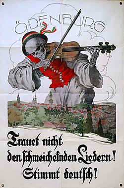 So sah dies 1908 ein „Kreis vaterländischer Schriftsteller“, der Ludwig Sendachs Eloge „Österreichs Hort“ als Einleitung zur gleichnamigen zweibändigen Festgabe an das österreichische Volk zur Jubelfeier des Kaisers Franz Josef I. 1908[62] auswählte. Darin wird in propagandistischem Überschwang betont, Österreich könne nicht fallen, „so lang […] die deutschen Lieder schallen“, „das deutsche Schwert bewacht“, die „deutsche Zucht und Sitte“ herrscht, deutsche „Mannestreue“ und deutsche Frauen walten: „So lang du Deutsch bist, Österreich, / So lang kannst du nicht fallen!“