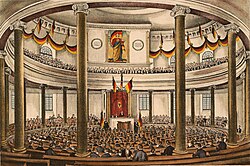 | Bild von der Eröffnung der Nationalversammlung 1848 in der Paulskirche in Frankfurt am Main. | Contemporary lithograph after a drawing by Leo von Elliott. From the German History in Documents site / High quality version | from a contemporary drawing of the Parliament in 1848; after a drawing by Ludwig von Elliot | Datei:Nationalversammlung in der Paulskirche.jpg | |