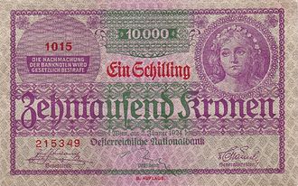 | Österreichische 10000 Kronen = 1 Schilling 1924 - Banknote - Vorderseite | http://www.banknote.ws/ | Unbekannt | Datei:10000Kronen=1Schilling1924vorne.jpg | |