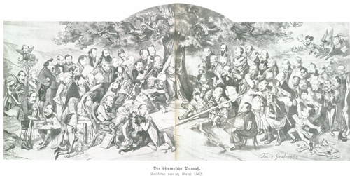 | Franz Gaul Der österreichische Parnass 1862. Legende zu dem Bild von de:Eduard Castle siehe c:File:Franz Gaul Der österreichische Parnass 1862 Legende.jpg | Eduard Castle (Hrsg.): Deutsch-österreichische Literaturgeschichte : ein Handbuch zur Geschichte der deutschen Dichtung in Österreich-Ungarn. - 3. Von 1848 bis 1918 . Wien: Fromme, 1935 | Franz Gaul | Datei:Franz Gaul Der österreichische Parnass 1862.png | |