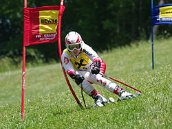 | Die österreichische Grasskiläuferin Ingrid Hirschhofer im zweiten Riesenslalomdurchgang der Österreichischen Meisterschaften im Grasskilauf 2010 in Rettenbach. | Eigenes Werk | Christian Jansky | Datei:Grasski-ÖM 2010 Ingrid Hirschhofer Riesenslalom.jpg | |