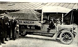 Im Jahre 1906 trat Ing. Alfred von Radio-Radiis in die kurz zuvor von den Ingenieuren Franz Probst, Moritz Schwarzl und Adolf Maschl gegründete Firma Kraftfahrzeug Ges.m.b.H. in Wien-Alsergrund ein und erwarb von der Schweizer Adolph Saurer AG in Arbon die Lizenz zur Lkw-Herstellung, wobei das Schweizer Stammhaus bis 1937 Hauptaktionär blieb. 1910 übernahm der aus einer alten Görzer Adelsfamilie stammende[1] Radio-Radiis die Leitung des Unternehmens und nahm kurze Zeit später seinen Bruder Gaston – ebenfalls ein ausgebildeter Ingenieur – als weiteren Geschäftsführer in die Firma auf, welche 1914 als Österreichische Saurerwerke, Kraftfahrzeug Ges.m.b.H. ins Wiener Handelsregister eingetragen wurde.[2] Bereits 1909 nahm die erste ganzjährig betriebene Postbuslinie in Österreich von Linz nach Eferding den Betrieb mit Saurer-Bussen auf.[3]