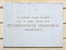 Schon bei ihrer Gründung 1945 verstand sich die ÖVP[8] – auch aus den Lehren der Ersten Republik, die in Austrofaschismus und Nationalsozialismus gemündet hatte – als breite bürgerliche Volkspartei, die katholische Soziallehre, Konservatismus und Liberalismus in sich vereinen sollte. Sie unterschied sich von der Vorgängerpartei, der Christlichsozialen Partei (CS), durch das Bekenntnis zur parlamentarischen Demokratie und zur österreichischen Nation.[6] Ihr Nationsbekenntnis knüpfte direkt an jenes der Österreichischen Aktion der Zwischenkriegszeit an.