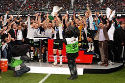 | Endspiel im Österreichischer Fußball-Cup 2009/10 SC Wiener Neustadt gegen SK Sturm Graz 0:1 (0:0) am 16. Mai 2010 im Wörtherseestadion in Klagenfurt - Die Spieler des SC Wiener Neustadt, hier Ronald Gercaliu , bei der Übergabe der Erinnerungsmedaillen für das Cup-Endspiel 2010. Den Siegerpokal (rechts) durften sie ansehen. | Eigenes Werk | Steindy ( talk ) 13:51, 22 May 2010 (UTC) | Datei:Ehrung der Spieler des SC Wiener Neustadt beim Cupfinale 2010.jpg | |