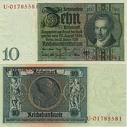 Fünf Tage nach dem „Anschluss“ Österreichs an das Dritte Reich wurde der Schilling am 17. März 1938 mit einem Umtauschwert von 1 RM = 1,50 Schilling durch die Reichsmark abgelöst, die Noten verloren zum 25. April ihre Zahlungskraft. Die Oesterreichische Nationalbank verlor am 25. April das Notenprivileg und wurde in ihrer Funktion aufgelöst, alle Goldbestände wurden von der Reichsbank requiriert.[9] Nach Ansicht der Oesterreichischen Nationalbank war dieser Umtauschkurs günstig festgelegt worden, um eine österreichische Zustimmung zum Anschluss zu fördern.[10]
