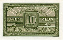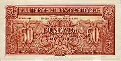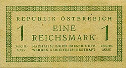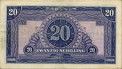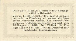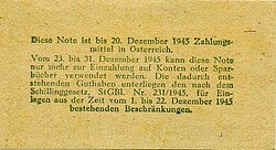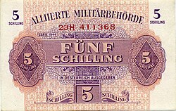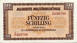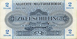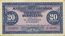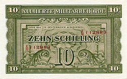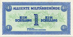 Nach der bedingungslosen Kapitulation der deutschen Wehrmacht Anfang Mai 1945 und der anschließenden Besetzung Österreichs strebte die Alliierte Kommission umgehend einen Ersatz der Reichsmark durch die frühere Schilling-Währung an.[12] Anders als in Italien oder Deutschland musste die Landeswährung nicht durch die „Allied Military Currency“ (Alliierter Militärschilling, Druck 1944 in den USA[13]) unterstützt, sondern vollständig zum Wechselkurs 1:1 verdrängt werden. Lediglich in der sowjetischen Besatzungszone wurde „Reichsmark“-Besatzungsgeld emittiert.
