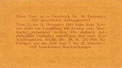 Bereits am 28. Juni 1945 konnten neue, von den Alliierten gedruckte Schilling-Briefmarken ausgegeben werden.[14] Das „Schillinggesetz“ vom 30. November 1945 regelte dann den Rücktausch restlicher Reichsmarkbestände zum Jahresende (max. 150 RM pro Kopf), von der Oesterreichischen Nationalbank konnten alte Schilling-Druckplatten der letzten Vorkriegsserie für die Banknotenproduktion reaktiviert werden.