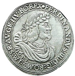 | Österreichischer Taler 1620 Erzherzogtum Österreich Kaiser Ferdinand II. Münzstätte Wien Matthias Fellner von Feldegg im Amt 1612-1617 und 1619-1659 Stempelschneider Hans Georg Ritter 1616-1623 Vom Reichsmünzfuß abweichende Prägung 8 1/8 Stück a.d.r. Mark, 9,11 Stück a.d.f. Mark Silber 14 Lot 4,5 Grän = 890,625‰ Feingewicht: 25,667 g nach Reichsmünzdeputation von 1623 Soll-Gewicht: 28,32 g Ist: 27,31 g Durchmesser: 43,71-44,73 mm Dicke: 2,04 mm Außerkurssetzung 1748 für 1 Taler 10 Groschen Konventionsgeld Brustbild des Kaisers mit Kaiserkrone im Koller mit großer Halskrause (Mühlsteinkragen) nach rechts; darunter in der Umschrift Münzstättenzeichen W, Titelumschrift begrenzt von Zierkreis, oben nach Krone beginnend: FERDINANDUS II DEI GRATIA ROMANORUM IMPERATOR SEMPER AUGUSTUS GERMANIAE HUNGARIAE ET BOHEMIAE REX = Ferdinand II. von Gottes Gnaden Römischer Kaiser, zu allen Zeiten Mehrer des Reichs, König in Germanien, Ungarn und Böhmen | Eigenes Werk | Eckhardju | Datei:Taler-Österreich-1620-av.jpg | |