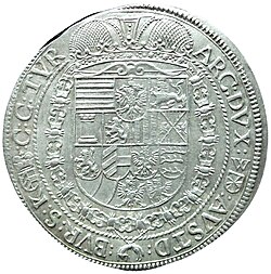 | Silbertaler Leopold V. von Österreich-Tirol LEOPOLDVS·D:G·ARCHIDVX·AVSTRIÆ // DVX·BVRGVND:COMES:TYROLIS Lateinisch: Leopoldus Deo Gratia Archidux Austriae, Dux Burgundis, Comes Tirolis Deutsch: Leopold von Gottes Gnade, Erzherzog von Österreich, Herzog von Burgund, Graf von Tirol Sollwerte: - Rauhgewicht: 28,819 g - Silbergehalt: 890,625 ‰ - Feingewicht: 25,667 g - Istgewicht: 28,68 g Prägestätte Hall im Tirol Weltlicher Taler | Eigenes Werk / Münze in Privatbesitz | Ralf Roletschek | Datei:1632 Leopold V von Oesterreich-Tirol Revers.jpg | |