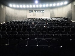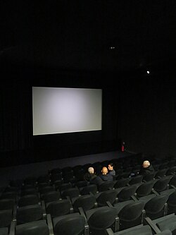 Unsichtbares Kino innen, ein schwarz-weißer Vorführraum, mit zwei Personen im Zuschauerraum, die die Räumlichkeit des Kinos definieren, mit Sicht nach hinten zur weißen Beleuchtung | Eigenes Werk | Burkhard Mücke | Datei:Österreichisches Filmmuseum 6.jpg | |