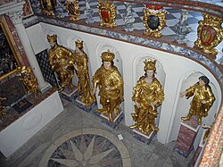 Lebensgroße vergoldete Statuen erinnern an die folgenden Personen, die im Kloster Stams begraben liegen: