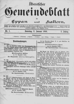 | Frontispiece of the historical Überetscher Gemeindeblatt for Eppan and Kaltern from 1910 | Überetscher Gemeindeblatt from 1910 (historical newspaper) | digital.tessmann.it (CC 4.0) | Datei:UA 1910 01 02 1 Cover 3 Jg.png | |