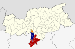 | Die Gemeinden der Südtiroler Bezirksgemeinschaft Überetsch-Unterland sind farblich markiert. Rot: Gemeindes des Unterlandes Blau:Gemeinden des Überetschs Orange: Gemeinden ,die politisch zur Bezirksgemeinschaft gehören, obwohl sie sich geographisch weder im Unterland noch im Überetsch befinden. | Eigenes Werk , based on File:Italy Bolzano-Bozen location map.svg by User:NordNordWest | Mai-Sachme | Datei:Überetsch-Unterland.svg |
