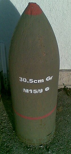 | Granate der 305-mm-Haubitze . Zum Größenvergleich eine serbische Fünf-Dinar-Münze (24mm Durchmesser) am unteren rechten Rand | Die Autorenschaft wurde nicht in einer maschinell lesbaren Form angegeben. Es wird angenommen, dass es sich um ein eigenes Werk handelt (basierend auf den Rechteinhaber-Angaben). | Die Autorenschaft wurde nicht in einer maschinell lesbaren Form angegeben. Es wird Nikola Smolenski als Autor angenommen (basierend auf den Rechteinhaber-Angaben). | Datei:Skoda 305 mm Model 1911 grenade.jpg |