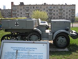 | A Citroën-Kegresse C6 P. 14 halftrack that was captured by the Wehrmacht and used by the Wehrmacht after that. This vehicle is displayed in a Russian military museum. | Поклонная гора | Dmitry | Datei:Citroën-Kegresse C6 P. 14.jpg |