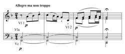 - Imitationen entstehen hauptsächlich durch den Wechsel kurzer melodischer Phrasen zwischen den Instrumenten (z. B. in T. 67–93) und nicht, wie ansonsten üblich, durch kontrapunktische Techniken.