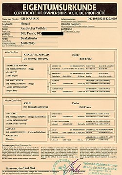 Die Papiere setzen sich aus zwei Dokumenten zusammen, der Eigentumsurkunde und dem Equidenpass. Der Abstammungsnachweis ist in den Equidenpass integriert.[1]