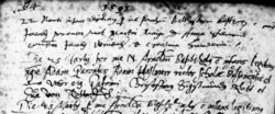 | Christening of Adam Haslmairs and his wifes Anna newborn son Adam in March 25, 1591, as recorded in the Parish register of Bozen from 1589-1614, p 64 | Files from 1583 and 1591, as stored on kirchenbuecher.suedtirol.it | Autor/-in unbekannt Unknown author | Datei:Adam Haslmair Taufbuch Bozen 1591 cropped.png |