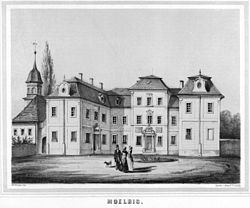 | Das Schloss in Mölbis um 1840 | Poenicke, G.A. (Hg.): Album der Rittergüter und Schlösser im Königreiche Sachsen, I. Section: Leipziger Kreis. Leipzig | F. Heise | Datei:Mölbis Schloss 1840.jpg |