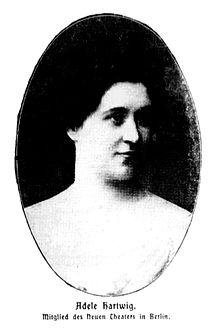 Ab 1906 trat sie dann wieder am Neuen Theater Berlin unter der Direktion von Alfred Schmieden auf.[4] Nach einem kurzen Intermezzo als Mitglied des Kleinen Theaters Berlin war sie ab 1907 als frei gastierende Schauspielerin tätig. Im Sommer 1909 gastierte sie mit ihrem eigenen Adele-Hartwig-Ensemble am Deutschen Theater Berlin, am Münchner Volkstheater und am Residenztheater in Frankfurt am Main, wo sie mit Harry Walden und Ernst Bach in Einaktern von Rudolf Presber, William Somerset Maugham, Walter Turszinsky und Hans Brennert auftrat. 1912 folgte ein Engagement am Berliner Komödienhaus. Dort spielte Hartwig die Titelrolle in der Komödie Die Zarin von Melchior Lengyel und Ludwig Biro (Premiere: 27. September 1912). Ab April 1913 leitete sie gemeinsam mit Toni Impekoven kurzzeitig das Komödienhaus, beide übernahmen zudem die Leitung des in Schwierigkeiten geratenen Friedrich-Wilhelmstädtischen Schauspielhauses. Ab 1914 war sie wieder frei gastierend tätig. Von 1915 bis 1918 leitete sie zusammen mit ihrem Ehemann, dem Schauspieler und Schriftsteller Walter Wassermann, das Deutsche Theater in Łódź, ein Fronttheater während des Ersten Weltkriegs, an dem sie auch als Schauspielerin und Regisseurin tätig wurde. Ab 1918 spielte sie wieder Theater in Berlin.