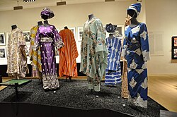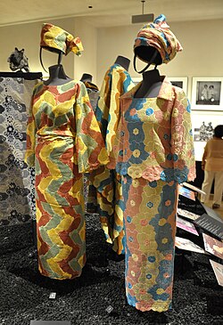 | Links: Dreiteiliges Damenkostüm, Nigeria, frühe 1970er Jahre; Baumwollstoff mit industrieller Lochstickerei; Vorarlberg Museum, Inv. Nr. Tr 2089 Rechts: Dreiteiliges Damenkostüm „Up and down“ mit „Gele“ (Kopftuch); Ibadan, Nigeria, frühe 1970er Jahre; Lochstickerei auf Baumwollstoff, gefüttert; Weltmuseum Wien, Inv. Nr. 187.511 a,b,c Fotografiert in der Ausstellung Lustenau Lagos African Lace im Vorarlberg Museum, Bregenz. | Selbst fotografiert | Wolf D. | Datei:African Lace VLM 60.jpg | |