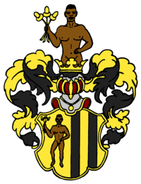 Blasonierung: Das Stammwappen zeigt in gespaltenem Schild rechts in Gold einen nackten Mohr, der in der Rechten einen grünen Zweig mit drei Eicheln hält. Links von Schwarz und Gold dreimal gespalten. Auf dem gekrönten Helm mit schwarz-goldenen Decken der nackte Mohr wachsend.
