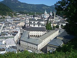 | Ansicht der Salzburger Altstadt vom Mönchsberg; im Vordergrund Gebäude der Universität Salzburg (Theologische Fakultät, Universitätsbibliothek), zuvor Sitz des Akademischen Gymnasiums Salzburg | Eigenes Werk | Niese | Datei:Studiengebäude bis 1967.jpg |