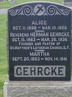 | Grabstein von Pastor Hermann Gehrcke und seiner Frau Martha | WildWestFisch | WildWestFisch | Datei:Gehrcke1.jpg | |