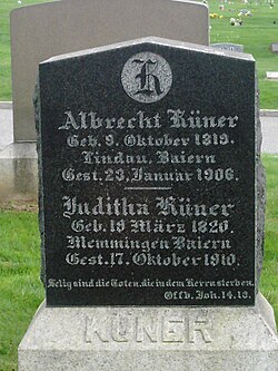 | San Francisco, Glasfenster in der St. Matthäus-Kirche zu Ehren von Albrecht Küner. Albrecht Küner aus Lindau (Bodensee) schuf die erste Gravur des Wappens von Kalifornien. 1849 kam er nach Kalifornien, um Gold zu suchen und blieb dann in San Francisco. Albrecht Küner gewidmet von Juditha Küner. | Eigenes Werk | Gary Hunt | Datei:Kuener Window 1.JPG | |