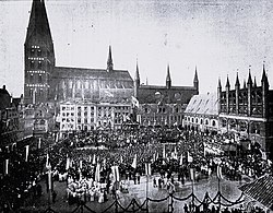 | Einzug der siegreichen Truppen am 18. Juni 1871. Dieses Bild wurde in "Bismarck - Härte und Empfindsamkeit", Deutsche Dokumentation 2014 von Wilfried Hauke, gelaufen u. a. auf arte, 21. Februar 2015, verwendet. | Einzug der siegreichen Truppen am 18. Juni 1871. In: Vaterstädtische Blätter , Jahrgang 1911, Nr. 26, Ausgabe vom 25. Juni 1911, S. 101. | Johannes Nöhring | Datei:HL Damals – 1871.jpg | |