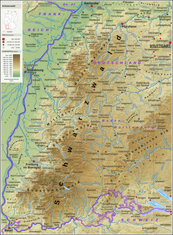 | Topografische Karte des Schwarzwaldes | Eigenes Werk mittels: Generic Mapping Tools (GMT) with SRTM3 V2.1 data OpenStreetMap data File:Karte_Bundesrepublik_Deutschland.svg by David Liuzzo | Thoroe | Datei:Schwarzwald - Deutsche Mittelgebirge, Serie A-de.png |