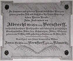 | Gedenktafel für Albrecht von Bernstorff (1809-1873) in der St. Abundus-Kirche in Lassahn, Mecklenburg-Vorpommern | Eigenes Werk (photo) | Niteshift ( talk ) | Datei:Lassahn Kirche Gedenktafel Albrecht von Bernstorff (1809-73) 2008-08-31 002kl.jpg | |