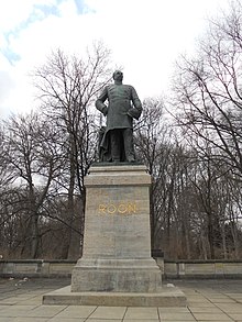 Das Roon-Denkmal in Berlin am nordwestlichen Rand des Großen Sterns im Großen Tiergarten von Harro Magnussen war 1904 zunächst am Anfang der Mittelpromenade der Alsenstraße am nördlichen Rand des Königsplatzes aufgestellt worden. Es war rund neun Meter hoch, die fünf Meter große in Bronze gegossene Plastik zeigt Roon aufrecht stehend in Uniform mit herabgesunkenem Mantel und abgenommener Pickelhaube.[15] Den Denkmalsockel aus schwarzem schwedischen Granit mit einem an der Vorderseite herausgemeißelten Eisernen Kreuz zierte ein halbkreisförmiger Umbau mit zwei bronzenen Lorbeerkranz an den Enden. In den Jahren 1938–1939 ließ Albert Speer im Zuge der Umformung Berlins zur „Reichshauptstadt Germania“ die Monumente für Roon, Bismarck und Helmuth von Moltke sowie die Siegessäule vom Königsplatz an den heutigen Standort versetzen, der als „Forum des Zweiten Reiches“ gedacht war. Dabei verlor das Roon-Denkmal seinen Unterbau und kam auf einen schlichten, etwas erhöhten Muschelkalksockel, um es an das Moltke-Denkmal anzugleichen.[16]