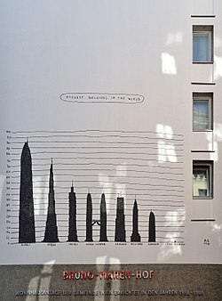 | Dieses Foto zeigt das im digitalen Kulturgüterverzeichnis von KÖR Wien (Österreich) unter der url buildings-on-buildings-2 ( commons , de ) aufgeführte Objekt. | Eigenes Werk | Herzi Pinki | Datei:Buildings on Buildings no. 2 by Aldo Giannotti, Bruno-Marek-Hof.jpg |