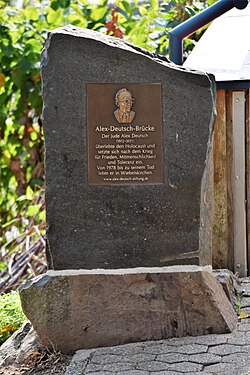 | Gedenkstein für Alex Deutsch an der nach ihm benannten Brücke über die Blies in Neunkirchen-Wiebelskirchen im Saarland | Eigenes Werk | Bärbel Miemietz | Datei:2022-08-26 Gedenkstein Alex Deutsch Wiebelskirchen 01.jpg | |